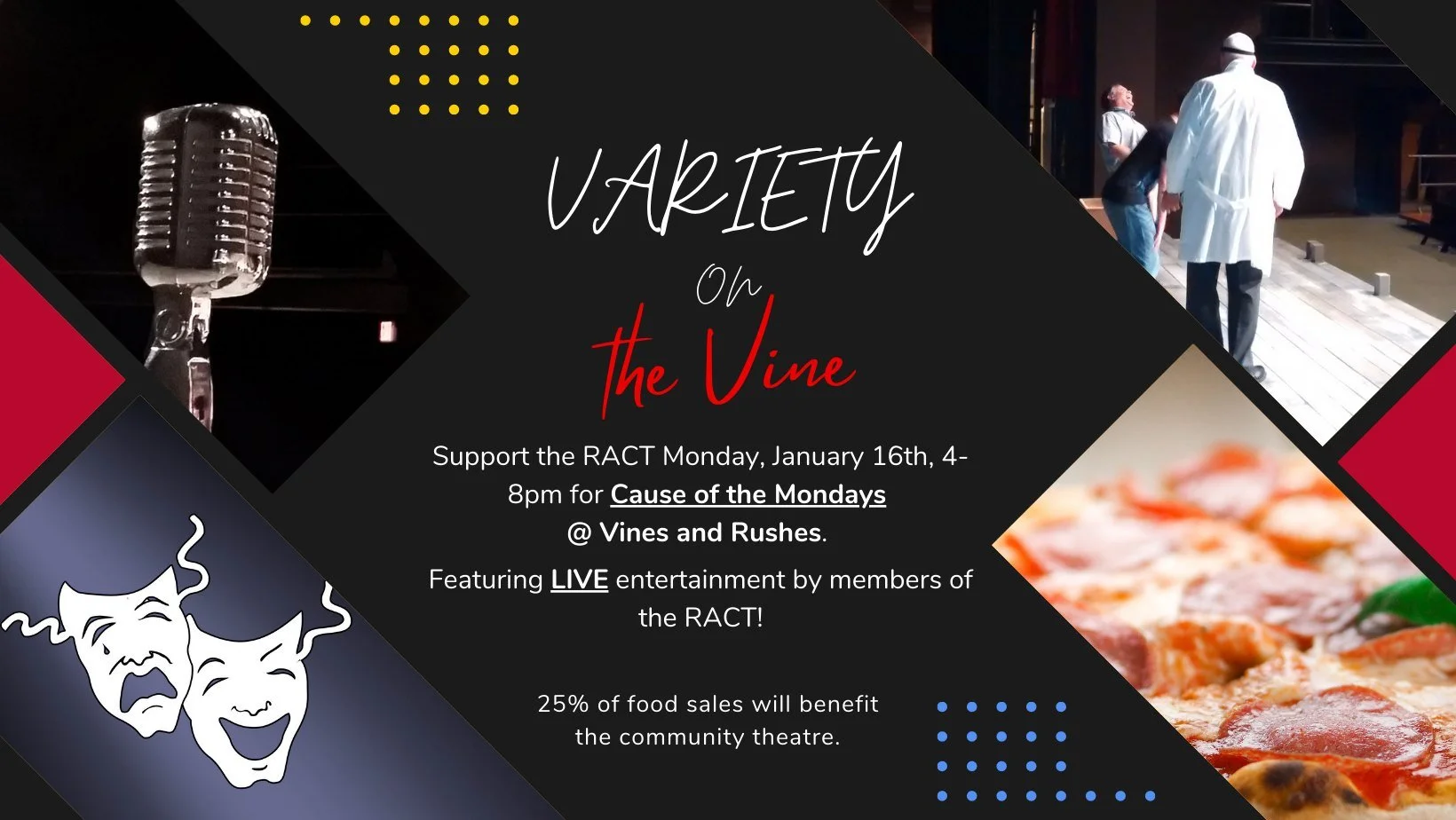 Help support the Ripon Area Community Theatre during Cause of the Mondays, Monday, January 16th from 4-8pm at Vines and Rushes Winery. 25% of the food sales, both dine-in and carry-out, plus cash tips will be donated to the community theatre!
