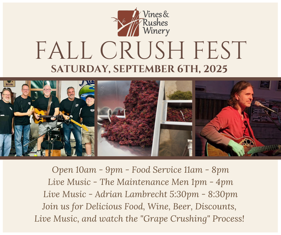 Join us for some delicious food, discounts, wine, beer, live music, and take a walk through the winery and watch the "grape crushing" process!