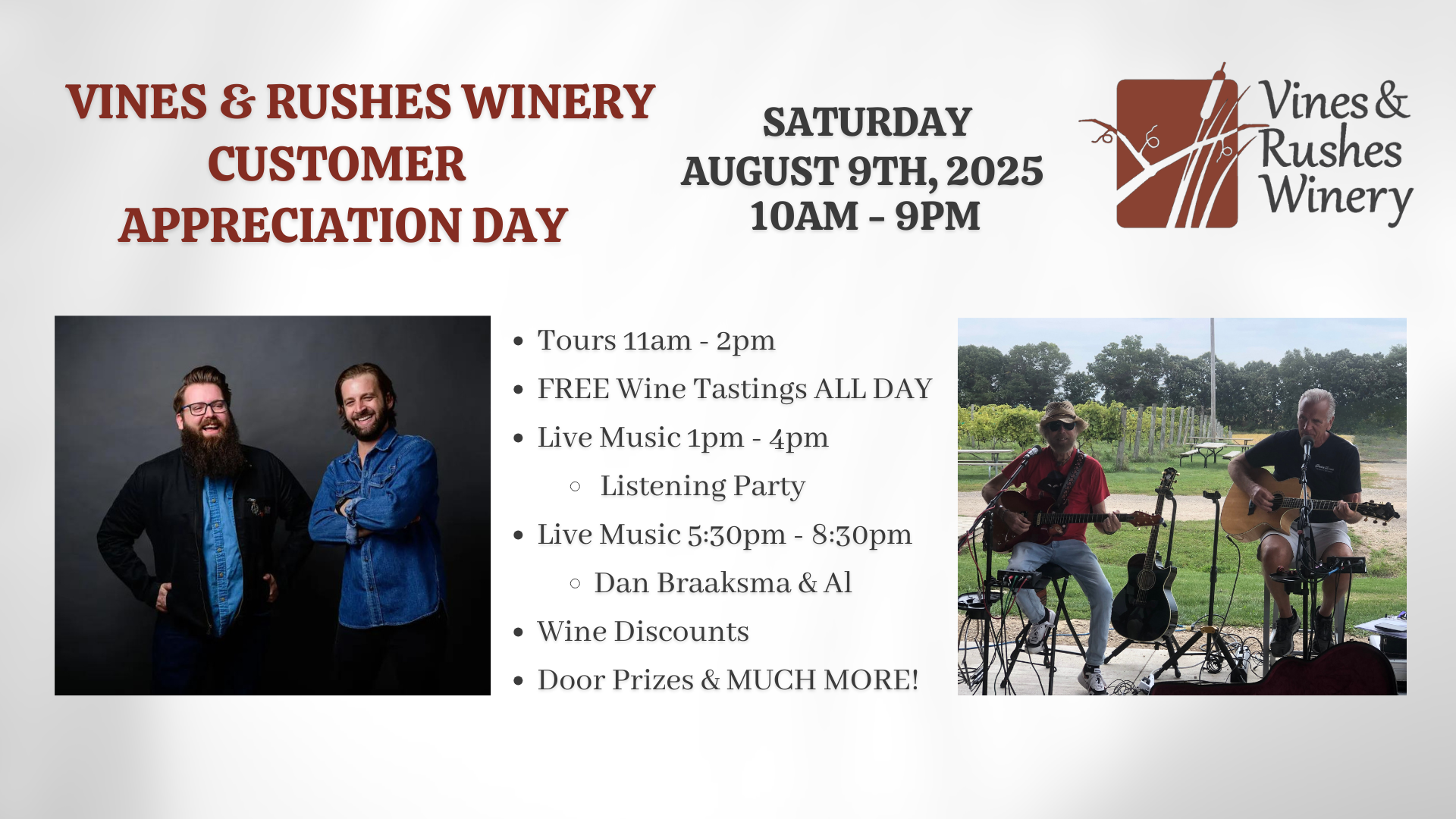 You won't want to miss this fun-filled day at Vines & Rushes Winery!